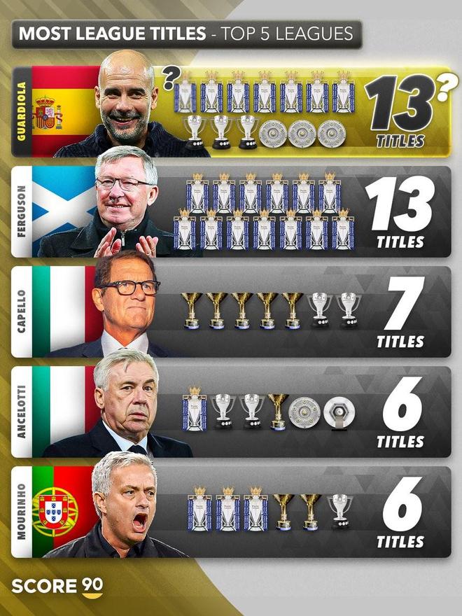 90年至今五大联赛主帅夺冠榜:弗格森13次第一,瓜帅12次第二